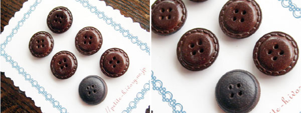 フランスから届いた、ヴィンテージの革のボタンです。 ステッチが効いて、良い感じ。 右の写真の右下は裏面です。