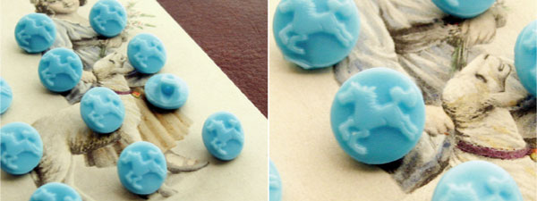 チェコから届いた、ヴィンテージの可愛いボタンです。 きれいなターコイズブルーのガラス素材に、馬の絵が浮き出ています。